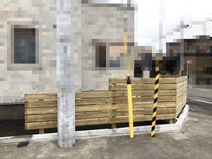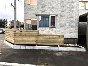 住宅敷地が角地だった為、人通りや目線が気になるので目隠しフェンスを。多少の傾斜があったので土留めをしてウッドテラスや花壇スペースを作りました。