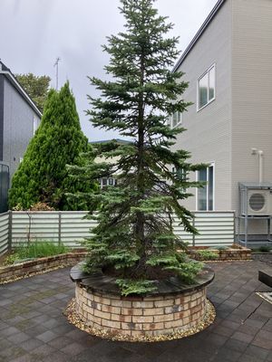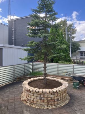 17年前に当社で施工し植えたプンゲンスが元気に育ってしまい、花壇兼ベンチが座れなくなってしまった為剪定と、ベンチ板も古くなった為レンガ笠にリフォームです。最初は伐採や伐根も考えましたがせっかくなので剪定で庭のシンボルとして残してみました。