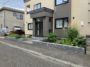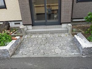 元々あったタイル貼り塀をDIYで解体して高さを半分位に下げてタイルも剥がして、出来る部分はご自分たちで全てやったからあとはプロに任せる。との事で塀のリニューアル仕上げと玄関前アプローチのリフォームをさせて頂きました。